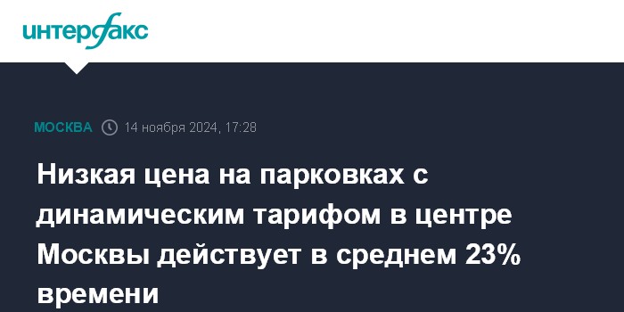 Москва. 14 ноября. INTERFAX.RU - Низкая стоимость парковки на пяти улицах в центре Москвы, где запущен с 1 ноября для водителей в пилотном режиме динамический тариф, держится в среднем 23% времени в течение суток, сообщил в четверг заммэра столицы по вопросам транспорта Максим Ликсутов.