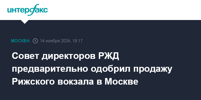 Москва. 14 ноября. INTERFAX.RU - Совет директоров ОАО "РЖД" предварительно одобрил продажу здания Рижского вокзала в Москве, сообщила компания.