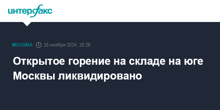 Москва. 25 ноября. INTERFAX.RU - Открытое горение на складском помещении на юге Москвы ликвидировано, на место происшествия направлен еще один вертолет, сообщили в пресс-службе МЧС РФ.