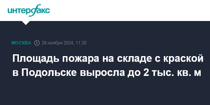 Москва. 28 ноября. INTERFAX.RU - Огонь, охвативший производственно-складское помещение с лакокрасочными изделиями в Подольске, распространился на 2 тыс. кв. м, сообщила пресс-служба МЧС РФ в четверг.