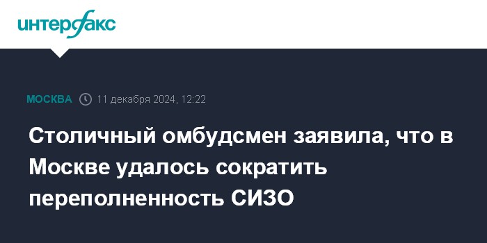 Москва. 11 декабря. INTERFAX.RU - В Москве за последние годы удалось сократить переполненность следственных изоляторов, сообщила уполномоченный по правам человека в столице Татьяна Потяева.