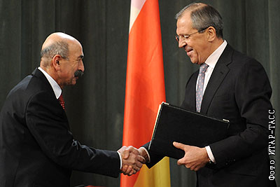 Министры иностранных дел Южной Осетии и России Мурат Джиоев и Сергей Лавров во время пресс-конференции по итогам переговоров