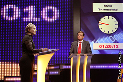 Кандидат в президенты Украины Юлия Тимошенко во время выступления на предвыборных теледебатах