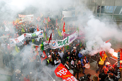 Демонстрация работников французского нефтяного гиганта Total в ближнем пригороде Парижа Ла-Дефансе, связанная с возможным сокращением 600 рабочих мест
