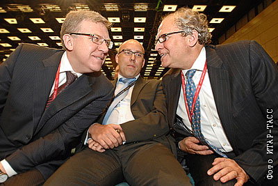 Министр финансов РФ Алексей Кудрин, основатель компании ARAM Global Майкл Бальбоа и старший научный сотрудник Института мировой экономики Андерс Аслунд (слева направо) на открытии Международного экономического форума "Россия-2010"