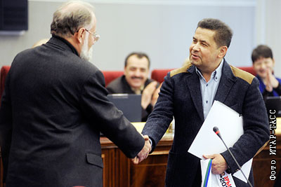 Председатель ЦИК РФ Владимир Чуров и солист группы "Любэ" Николай Расторгуев, зарегистрированный в качестве депутата Госдумы РФ от "Единой России", (слева направо) на заседании Центризбиркома