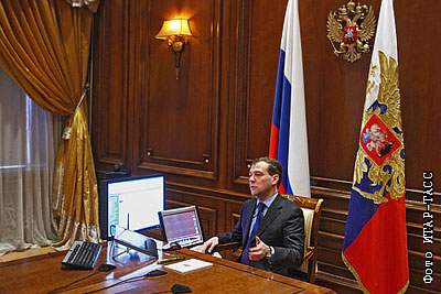 Президент России Дмитрий Медведев во время видеоконференции с губернатором Челябинской области П.Суминым в резиденции "Горки"
