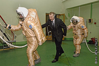 Генеральный директор, главный конструктор НПП "Звезда" им академика Г.И. Северина Сергей Поздняков (в центре) во время контрольных испытаний скафандров, которые будут задействованы в эксперименте "Марс-500" при имитации выхода космонавта на "марсианскую поверхность", во время контрольных испытаний на Научно-производственном предприятии (НПП) "Звезда"
