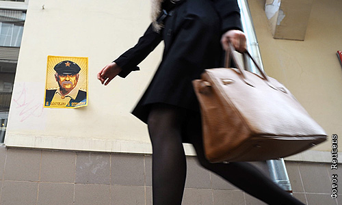 Плакат с изображением режиссера Никиты Михалкова на одном из домов в Малом Козихинском переулке, где студия Н.Михалкова "Тритэ" совместно с компанией "БЭЛ Девелопмент" строит гостиницу.