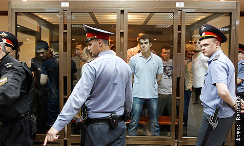 Обвиняемые по делу о массовых беспорядках на Болотной площади 6 мая, в зале заседаний Мосгорсуда.