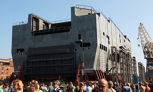 Спуск на воду кормовой части первого российского десантно-вертолетного корабля-дока (ДВКД) типа "Мистраль" - "Владивосток" на ООО "Балтийский завод — Судостроение".