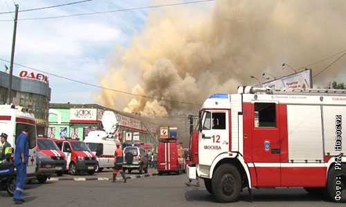 Сотрудники пожарной службы МЧС работают на месте пожара в здании торгового центра в московском районе Лефортово. По последним данным, площадь пожара возросла до 1400 квадратных метров.