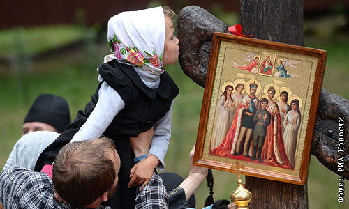 Ребенок целует поклонный крест на Ганиной Яме, где были похоронены останки в Екатеринбурге.