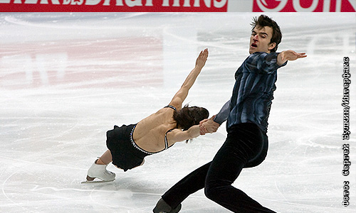 Канадские фигуристы Меган Дюамель и Эрик Рэдфорд, получивший травму, во время выступления в короткой программе на Чемпионате мира по фигурному катанию-2011.