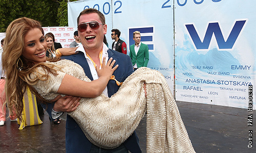 Певица Габриэлла и директор по развитию ООО "Торговый дом "Регионы" Виталий Чекулаев на открытии международного конкурса молодых исполнителей популярной музыки "Новая волна 2013" в Юрмале.
