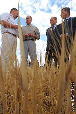 Гендиректор ООО "Экспериментальное" Станислав Моисеев, премьер-министр России Владимир Путин, губернатор Оренбургской области Алексей Чернышев и первый вице-премьер правительства России Виктор Зубков во время посещения ООО "Экспериментальное"