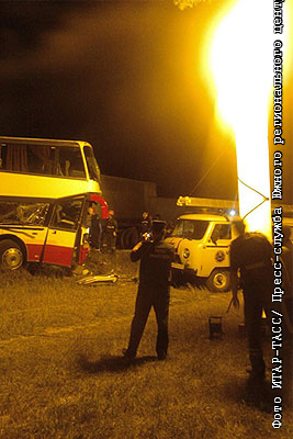Сотрудники МЧС на месте столкновения грузовика "Рено" с пассажирским двухэтажным автобусом "Фетра" на трассе "Дон", в результате которого пострадали 27 пассажиров автобуса, водитель грузовика погиб