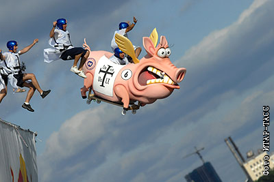 Участники соревнования Red Bull Flugtag на самодельном летательном аппарате в виде свиньи в Строгинской пойме Москвы-реки