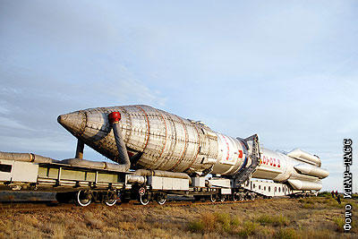 Ракета-носитель "Протон-М" с китайским телекоммуникационным спутником AsiaSat-5 во время вывоза на стартовый комплекс космодрома Байконур