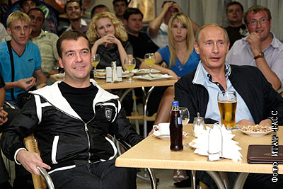 Президент РФ Дмитрий Медведев и председатель правительства РФ Владимир Путин за столиком кафе во время трансляции товарищеского матча между сборными России и Аргентины по футболу