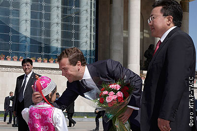 Президент России Дмитрий Медведев и президент Монголии Цахиагийн Элбэгдорж во время торжественной церемонии встречи у Государственного дворца