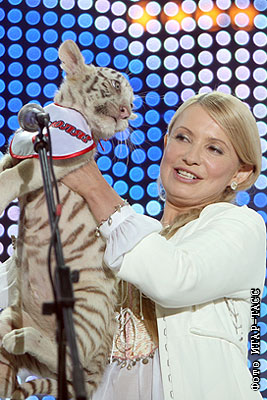 Премьер-министр Украины Юлия Тимошенко с бенгальской тигрицей-альбиносом, которую ей подарили на детском фестивале "Черноморские игры"