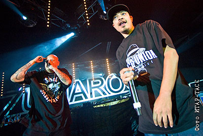 Участник американской группы Psycho Realm Джек Гонзалес и один из лидеров группы Cypress Hill DJ Muggs (слева направо) во время совместного выступления в клубе "Milk"