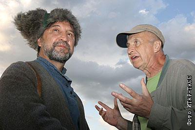 Актер Юрий Шевчук и автор сценария Андрей Смирнов во время съемок фильма "Жила-была одна баба"