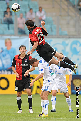 Игроки "Химок" Илья Максимов, Иван Цветкович и "Зенита" Игорь Семшов и Игорь Денисов (слева направо) в матче чемпионата России по футболу: "Химки" (Московская область) - "Зенит" (Санкт-Петербург) - 0:4