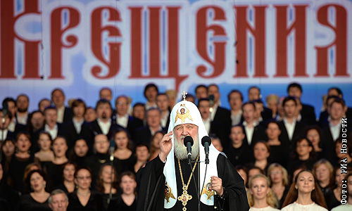 Патриарх Московский и всея Руси Кирилл обращается с речью к зрителям на праздничном концерте в честь 1025-летия Крещения Руси на Красной площади в Москве.