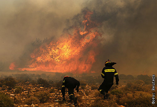 Огонь В Греции бушует по всему восточному побережью. Пожарные пытаются локализовать пламя, но мешает сильный ветер и жара — температура в стране достигает 37 градусов в тени.