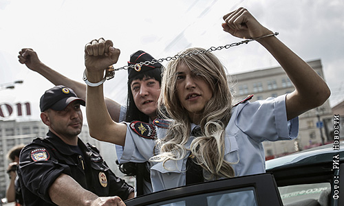 Сотрудники правоохранительных органов задерживают у станции метро "Октябрьская" участников акции в защиту ЛГБТ-сообщества.