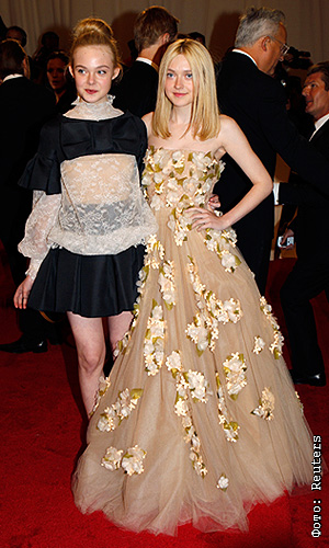 Сестры Элль и Дакота Фаннинг на торжественном открытии выставки "Alexander McQueen: Savage Beauty" в Метрополитен-музее в Нью-Йорке