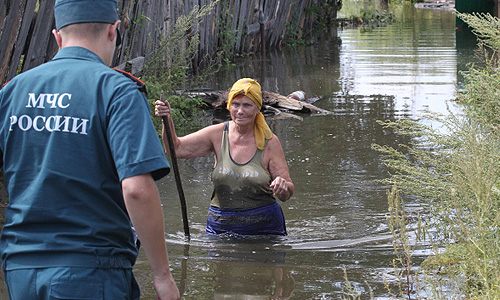 Сотрудник МЧС разговаривает с дачницей, отказавшейся от эвакуации из подтопленного паводковыми водами дома в поселке Уссурийском на Большом Уссурийском острове под Хабаровском.