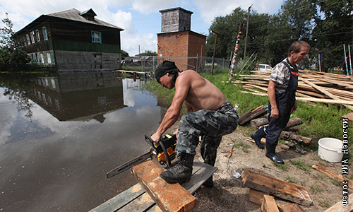 Местные жители строят деревянный мост к подтопленному паводковыми водами Амура дому в поселке Уссурийском на Большом Уссурийском острове под Хабаровском.