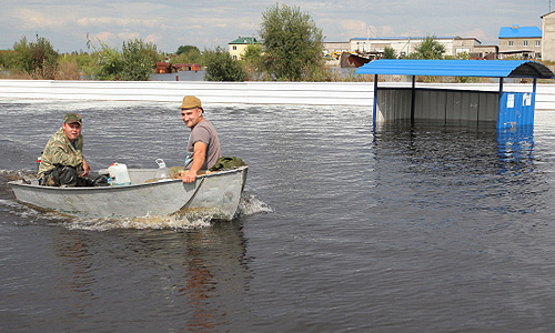 Жители затопленного поселка Владимировка, расположенного в трех километрах от города Благовещенск Амурской области, плывут на лодке по улице.