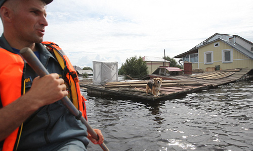 Собака стоит на крыше затопленного дома в поселке Владимировка, расположенном в трех километрах от города Благовещенск Амурской области.