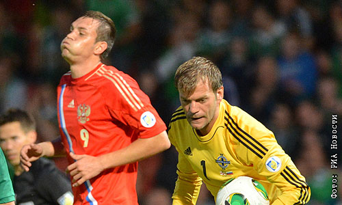 Игрок сборной России Артем Дзюба (слева) и вратарь сборной Северной Ирландии Рой Кэрролл в матче отборочного тура Чемпионата мира-2014 между сборными командами Северной Ирландии и России.