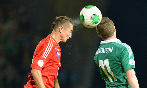 Игрок сборной России Владимир Быстров (слева) и игрок сборной Северной Ирландии Шейн Фергюсон в матче отборочного тура Чемпионата мира-2014 между сборными командами Северной Ирландии и России.