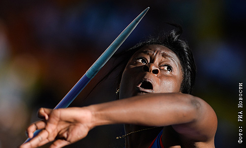Колумбийка Флор Руис в квалификационных соревнованиях по метанию копья среди женщин на чемпионате мира по легкой атлетике в Москве.