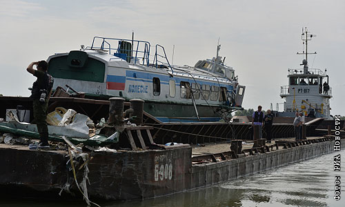 Потерпевший крушение на реке Иртыш теплоход "Полесье-8" поднят из воды. 17 августа на реке Иртыш вблизи поселка Новая Станица пассажирский теплоход столкнулся с баржей и получил пробоину.