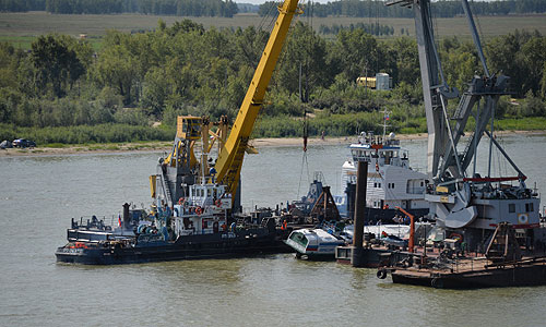 Потерпевший крушение на реке Иртыш теплоход "Полесье-8" поднят из воды. 17 августа на реке Иртыш вблизи поселка Новая Станица пассажирский теплоход столкнулся с баржей и получил пробоину.