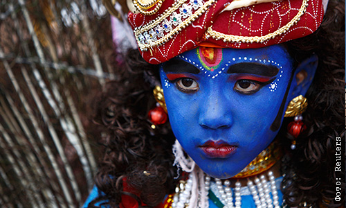 Мальчик, одетый богом Кришной, во время празднования Gaijatra, или "праздника коров", в Непале.
