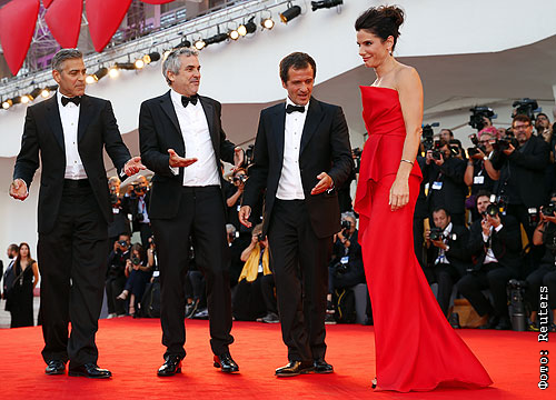 Актер Джордж Клуни, режиссер Альфонсо Куарон и продюсер Дэвид Хейман приветствуют актрису Сандру Буллок.