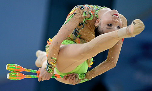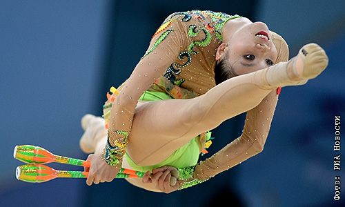 Дэн Сэньюэ (Китай) выполняет упражнения с булавами во время квалификационных соревнований в индивидуальном многоборье на чемпионате мира по художественной гимнастике в Киеве.