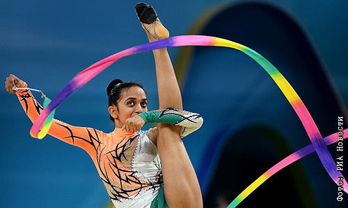 Ништа Шан (Индия) выполняет упражнения с лентой во время квалификационных соревнований в индивидуальном многоборье на чемпионате мира по художественной гимнастике в Киеве.