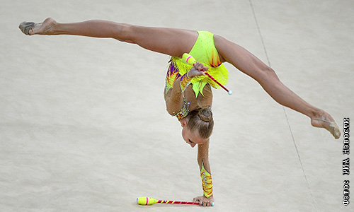 Яна Кудрявцева (Россия) выполняет упражнения с булавами во время финальных соревнований в личном первенстве на чемпионате мира по художественной гимнастике в Киеве.