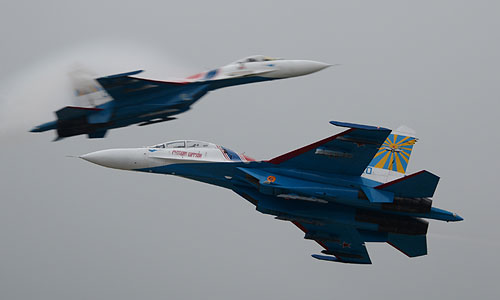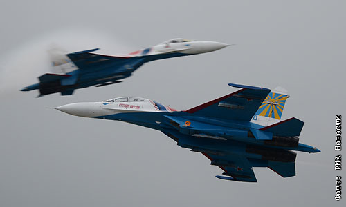 Истребители Су-27 пилотажной группы "Русские Витязи" на Международном авиационно-космическом салоне МАКС-2013 в Жуковском.