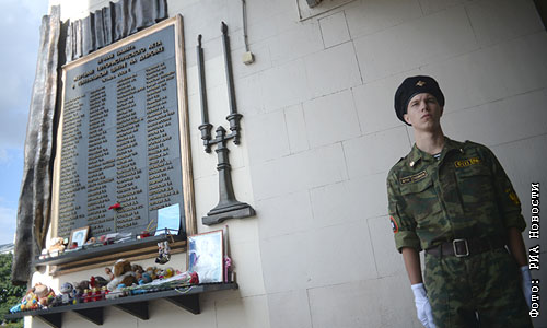 Почетный караул у мемориальной доски на стене Театрального центра на Дубровке в Москве.