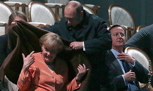 Владимир Путин, канцлер Германии Ангела Меркель и премьер-министр Великобритании Дэвид Кэмерон на представлении фрагмента из балета "Руслан и Людмила" у Большого каскада фонтанов Петергофа.